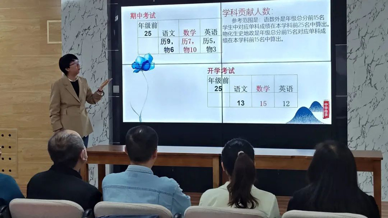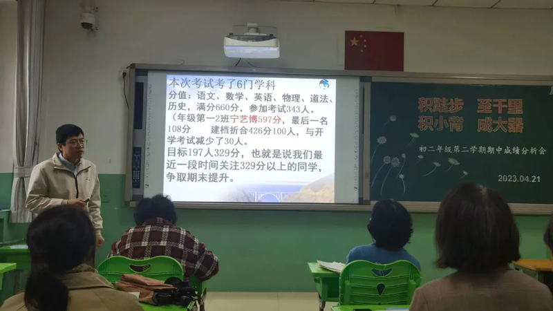 初二年級的成績分析主題是《積跬步 至千里 積小背 成大器》,王力主任對本次考試情況作了詳盡的數(shù)據(jù)分析,優(yōu)秀教師錢方、李瑞鳳做了經(jīng)驗分享。